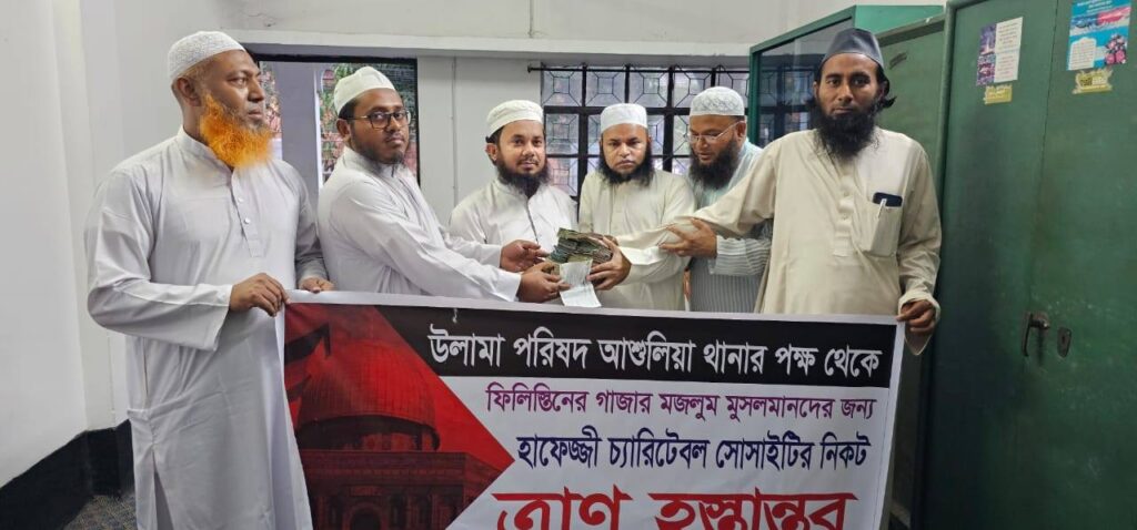 এসময় প্রতিনিধিদলে ছিলেন উলামা পরিষদ আশুলিয়া থানার সম্মানিত সিনিয়র সহ-সভাপতি হাফেজ মাওলানা আতাউল্লাহ সাহেব, সম্মানিত যুগ্ম সাধারণ সম্পাদক মাওলানা মাহমুদুল কবির মনির, সম্মানিত সাংগঠনিক সম্পাদক মুফতি হাবিবুল্লাহ আশরাফ, সম্মানিত যুগ্ন সাংগঠনিক সম্পাদক মুফতি আল আমিন খন্দকার আমিনি,হাফেজ মাওলানা মুদ্দাসসির সাহেব,প্রতিষ্ঠা ও পরিচালক রিয়াজিল জান্নাহ মাদ্রাসা। হাফেজ মাওলানা জহির উদ্দিন,প্রতিষ্ঠা ও পরিচালক মারকাযুত তালীম মাদ্রাসা। উপস্থিত প্রতিনিধি দলের উদ্দেশে সংস্থার সদস্য বিশিষ্ট সাংবাদিক মোঃ মোশাররফ হোসাইন রাজু বলে ৭ অক্টোবর ২০২৩ যুদ্ধ শুরুর পর থেকে গাজায় এমন বহু ঐতিহাসিক কাজ করেছে হাফেজ্জী চ্যারিটেবল সোসাইটি। পানি, খাদ্য, নগদ অর্থ, তাবু বিতরণ সহ বিভিন্ন সেবামূলক কাজ গাজা, খান ইউনূস, ধৈইর, আল-বালাহাতে মানবিক সেবার চেষ্টা করে যাচ্ছে। তাদের এই মহতী কার্যক্রম উঠে এসেছে দেশের সব প্রথম সারির গণমাধ্যমে!“হাফেজ্জী হুজুর চ্যারিটেবল সোসাইটি অব বাংলাদেশ ”প্রতিষ্ঠা লাভ করেছে বাংলাদেশের আলেম কুলের শিরোমণি মুহাম্মাদুল্লাহ হাফেজ্জী হুজুর রহ. এর চিন্তা চেতনা, তাঁর মানবসেবা ও স্বপ্ন নিয়ে। তাঁর চেতনায় অনুপ্রাণিত হয়ে তাঁর নামে প্রতিষ্ঠিত এবং বাংলাদেশ সরকার কর্তৃক অনুমোদিত এটি একমাত্র প্রতিষ্ঠান। সদকায়ে জারিয়ার উদ্দেশ্যে আর্ত মানবতার সেবায় আপনিও দান করতে পারেন এখানে। হতে পারেন এর একজন গর্বিত সদস্যও।