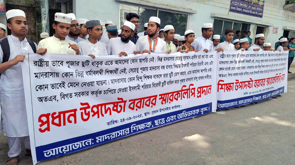 দেশের আলিয়া মাদ্রাসাগুলোতে মুসলিম ছাড়া অন্যান্য ধর্মাবলম্বী শিক্ষার্থী না থাকায় আসন্ন দুর্গা পূজাসহ ভিন্ন ধর্মাবলম্বীদের সব ছুটি বাতিল করে মাদ্রাসা খোলা রাখার দাবি জানিয়েছে মাদ্রাসার শিক্ষক-ছাত্র এবং অভিভাবকরা।