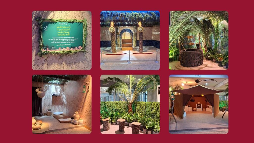 প্রদর্শনী ঘুরে দেখা যায় খেজুর পাতা দিয়ে ছাওয়া কুঁড়েঘরের মতো স্থাপনা, সে যুগের আসবাবপত্র, মাটির তৈরি পাত্র, বালু-মাটির দেয়াল ও মেঝে, প্রাচীন কূপের প্রতিকৃতি এবং সবুজ গাছপালায় সজ্জিত বসার স্থান। এই সজ্জা মরুভূমির তৎকালীন পরিবেশ এবং নবীজির সাদামাটা জীবনকে ফুটিয়ে তুলেছে।